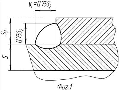 Известен классический способ выполнения нахлесточных швов на укрепляющих кольцах штуцеров (воротников), который выполняется традиционно в размерность катета шва, равную К=0,75S2, где S2 – толщина укрепляющего кольца. Нахлесточный шов испытывает максимальное напряжение в пределах 45° от корня шва к основанию катета и по этой же линии происходит характерное разрушение сварного шва при чрезмерных нагрузках. В линейной размерности линия разрушения определяется формулой 0,7К, где К – катет шва, а верхняя точка разрушения при этом равна n=0,4S2. Классический способ приварки укрепляющих колец представлен на фиг.1.