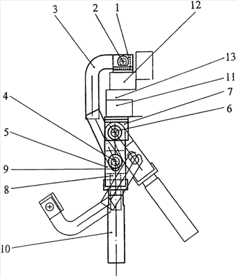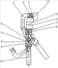 По окончании формовочного процесса, когда зажим нужно разблокировать, рычаг 5 отклоняют от вертикального положения за рукоятку 10 в исходное положение. Чтобы полускобу 3 с пятой 1 снять с фланца пуансона 12, рукоятку 10 вращают против часовой стрелки, тем самым, уменьшая расстояние между осями 4 и 6. Эта манипуляция приводит к появлению зазора между пятой 1 и деталью 12, вследствие чего полускоба 3 свободно вращается вокруг оси 4 и переводится вниз в исходное положение.