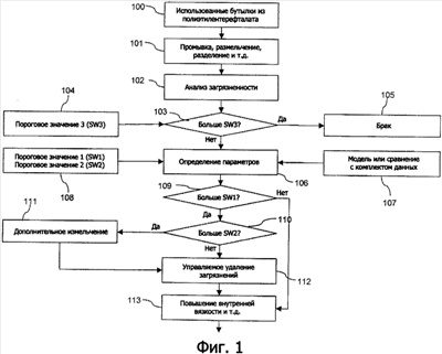 Исходя из этого первого примера выполнения, можно реализовывать также другие варианты выполнения. Так, например, не обязательно необходимо измельчать бутылки из полиэтилентерефталата уже перед анализом загрязнения, а можно проверять еще не разрушенные бутылки из полиэтилентерефталата на предмет степени их загрязненности. В другом варианте выполнения можно перед стадией 102 анализа загрязнения выполнять разделение хлопьев полиэтилентерефталата, при этом хлопья полиэтилентерефталата, которые принадлежат более толстым верхним частям бутылок, отделяют от хлопьев полиэтилентерефталата остальных частей бутылки. Это представляет интерес потому, что хлопья полиэтилентерефталата из верхней части бутылки толще, чем из остальных частей бутылки, и поэтому их труднее очищать, поскольку загрязнения находятся глубже в материале полиэтилентерефталата. В описанном примере выполнения в качестве параметров процесса удаления загрязнений названы температура процесса и длительность процесса. Однако они являются лишь двумя примерами параметров процесса, поскольку при необходимости можно согласовывать также используемые для удаления загрязнений чистящие средства.