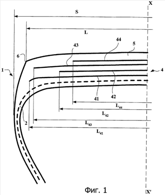 Представленная на фиг.2 пневматическая шина 1 отличается от пневматической шины, представленной на фиг.1, тем, что два рабочих слоя 41 и 43 гребня, с каждой стороны от экваториальной плоскости и на продолжении в осевом направлении слоя окружных подкрепляющих элементов 42, соединены между собой на некоторой осевой ширине I, при этом кордные тросики первого рабочего слоя 41 и кордные тросики второго рабочего слоя 43 на осевой ширине соединения I двух этих слоев отделены друг от друга в радиальном направлении слоем каучука, толщина которого является минимальной и соответствует двойной толщине каучукового слоя каландрирования скрепленных металлических кордных тросиков, отвечающих формуле 27.23, из которых сформирован каждый рабочий слой 41, 43, то есть равна 0,8 мм. На оставшейся общей ширине двух рабочих слоев два рабочих слоя 41, 43 гребня отделены друг от друга при помощи каучукового профилированного элемента, не представленного на рассматриваемой здесь фигуре, причем толщина этого профилированного элемента является возрастающей в направлении от осевого конца зоны соединения к концу наименее широкого рабочего слоя. Этот профилированный элемент предпочтительным образом имеет ширину, достаточную для того, чтобы перекрыть в радиальном направлении конец наиболее широкого рабочего слоя гребня 41, который в рассматриваемом здесь случае представляет собой рабочий слой, наиболее близкий в радиальном направлении к арматуре каркаса.