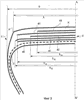 На фиг.5 представлен схематический вид в вертикальном осевом разрезе пневматической шины 1, на котором показана первая касательная 7 к поверхности наружного в осевом направлении конца беговой дорожки протектора 8. При этом поверхность беговой дорожки протектора определяется наружной в радиальном направлении поверхностью или вершиной рельефного рисунка протектора, не показанного на приведенных в приложении фигурах. Вторая касательная 9 к поверхности наружного в радиальном направлении конца боковины 10 пересекает упомянутую первую касательную 7 в точке 11. Ортогональная проекция этой точки на наружную поверхность пневматической шины определяет конец плечевой зоны 6 данной пневматической шины.