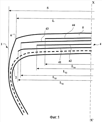 Осевая ширина L41 первого рабочего слоя 41 гребня составляет 248 мм, что для пневматической шины обычной формы, по существу, меньше ширины L беговой дорожки протектора, которая в рассматриваемом случае составляет 262 мм. Различие между шириной беговой дорожки протектора и шириной L41 составляет, таким образом, 14 мм и, следовательно, меньше 15 мм в соответствии с предлагаемым изобретением.