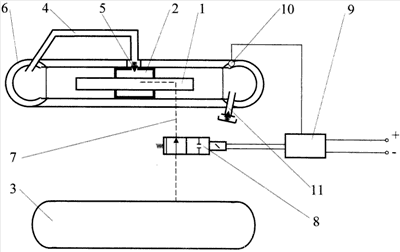 При движении транспортного средства в пневматической шине 6 при ее деформации выделяется тепло, температура шины 6 увеличивается и при этом измеряется датчиком температуры 10. При достижении шиной 6 температуры 70-75°С – оптимальной с точки зрения долговечности и сопротивления качению колеса [1], блок управления 9, получив электрический сигнал от датчика температуры 10, соединяет электромагнитный клапан 8 с источником питания, в результате электромагнитный клапан 8 открывается. Сжатый воздух под давлением из воздушного ресивера 3, по магистрали 7, через открытый электромагнитный клапан 8 и цапфу 1 колеса поступает в полость внутреннего уплотнения 2, постепенно увеличивая в ней давление. При увеличении во внутреннем уплотнении 2 давления воздуха больше в 3.7 раза по сравнению с номинальным давлением в шинах открывается клапан 5 и воздух по трубопроводу 4 поступает в полость шины 6. В результате адиабатного расширения поступившего воздуха произойдет его охлаждение до -50°С и последует охлаждение воздуха, находившегося в полости шины 6 и внутренней поверхности шины. При этом возрастание давления воздуха в шине 6 ограничивается предохранительным клапаном 11, открывающимся при увеличении давления воздуха больше номинального. Воздух, выходя через предохранительный клапан 11, охлаждается из-за быстрого расширения и попадает на наружную поверхность шины 6, охлаждая ее. Охлаждение шины приводит к снижению электрического сигнала от датчика температуры 10, вследствие чего блок управления 9 перестает подавать электрический ток на электромагнитный клапан 8, в результате чего он закрывается, и хладагент перестает поступать из воздушного ресивера 3 в пневматическую шину 6.