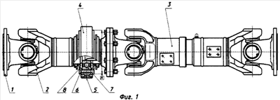 Карданная передача при установке на автомобиль или другое транспортное средство крепится к соединяемым агрегатам фланец-вилками 1, которые через карданные шарниры неравных угловых скоростей 2 соединены с механизмом изменения длины 3.