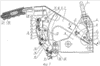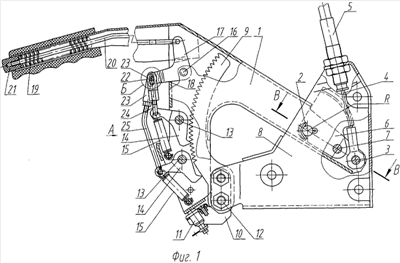Принципиальная конструкция рычага привода стояночного тормоза с двумя фиксирующими собачками представлена на фиг.1 и включает рычаг 1, выполненный с возможностью поворота вокруг пальца 2, соединенный через штифт 3 с канатом троса 4, который, в свою очередь, проходя в оболочке 5 или без нее, соединен с тормозным механизмом (не показан). Канат троса 4 укладывается в желоб с радиусом R легко демонтируемого сменного сектора 6. Меняя радиус R установкой другого сектора 6 при сборке рычага, изменяется его передаточное число. Сектор 6 фиксируется в рычаге 1 между его стенками при помощи пальца 2 и штифта 7. Корпус 8 служит для крепления пальца 2, зубчатого сектора 9 и кронштейна 10 электрического выключателя 11 с помощью болтов 12, оболочки троса 5 и осуществляет крепление рычага в сборе к кузову автомобиля. В рычаге 1 на пальцах 13 поворачиваются собачки фиксации 14, у которых зуб постоянно стремится войти в зацепление с зубчатым сектором 9 под действием пружин 15, закрепленных одним концом на рычаге 1, а другим – на собачке 14. На пальце 16, расположенном в рычаге 1, поворачивается двуплечий рычаг 17, который постоянно стремится повернуться до упора 18 на рычаге 1 под действием пружины 19 через тягу 20 и кнопку 21. На пальце 22, установленном на двуплечем рычаге 17, надеты наконечники 23 с продольным пазом, соединенные с собачками 14 при помощи тяг 24 и 25, длина которых регулируется при сборке с помощью резьбы на них и в наконечниках 23 для обеспечения зазора Г в положении, когда собачки 14 находятся полностью во впадине зуба зубчатого сектора 9. Продольные пазы в наконечниках 23 позволяют собачкам 14 независимо друг от друга поворачиваться, перескакивая по зубчатому сектору 9 при перемещении рычага 1, а при нажатии на кнопку 21, через тягу 20, рычаг 17, палец 22, наконечники 23, тяги 24 и 25 поворачивать одновременно обе собачки 14, выводя их из зацепления с зубчатым сектором 9.