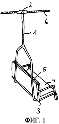 Фиг.1 схематично показывает типичную подвеску 1, которая с помощью корпуса 2 зажима связана с подъемным канатом 6. На подвеске закреплено кресло для нескольких человек. Кресло содержит подушку 4 сиденья, а также подушку 5 спинки.