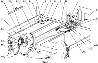 Для обеспечения беспрепятственного поворота тележки относительно своей оси 20 – без контакта ее с элементами рамы, например со шкворневой балкой 21 (фиг.6) или другими поперечными балками или элементами вагона – кронштейн 19 может быть расположен не только под прямым углом, но и под углом =5-50 градусов к поперечной оси 22 тележки (фиг.6) и приварен или закреплен жестко на боковине 18 другим способом, например, с помощью болтового соединения 23 (фиг.2). Кронштейн 19 может бать также не прямым, а Г-образным, криволинейным и т.п. (не показано). Для закрепления кронштейна могут быть использованы выступы, приливы, отверстия и т.п., имеющиеся в конструкции тележки или выполненные на ней специально для этой цели. На фиг.2 показано закрепление кронштейна 19 к кронштейну 24 боковины 18, предназначенному для крепления к тележке тормозных деталей. Кронштейн 24 со стороны автосцепки 2 (торца вагона) в стандартных тележках типа 18-100 грузовых вагонов обычно свободен.