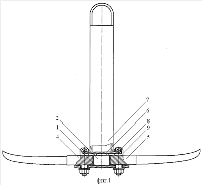 Наиболее близким по технической сущности является устройство (а.с. №901150, МКИ В63В 21/36), содержащее веретено, имеющее нижнюю головку и крестовину с шарнирно установленными складными составными лапами с ограничением угла их раскрытия.