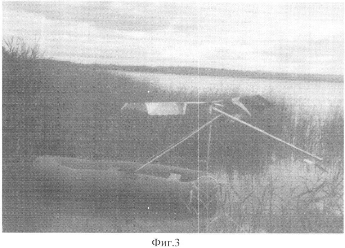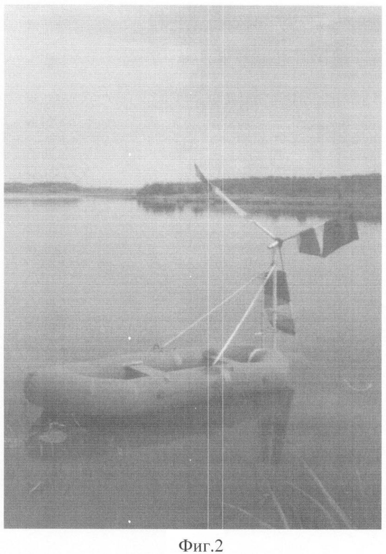 На фиг.2 изображен общий вид подвесного ветродвигателя с гибкими лопастями на надувной лодке.