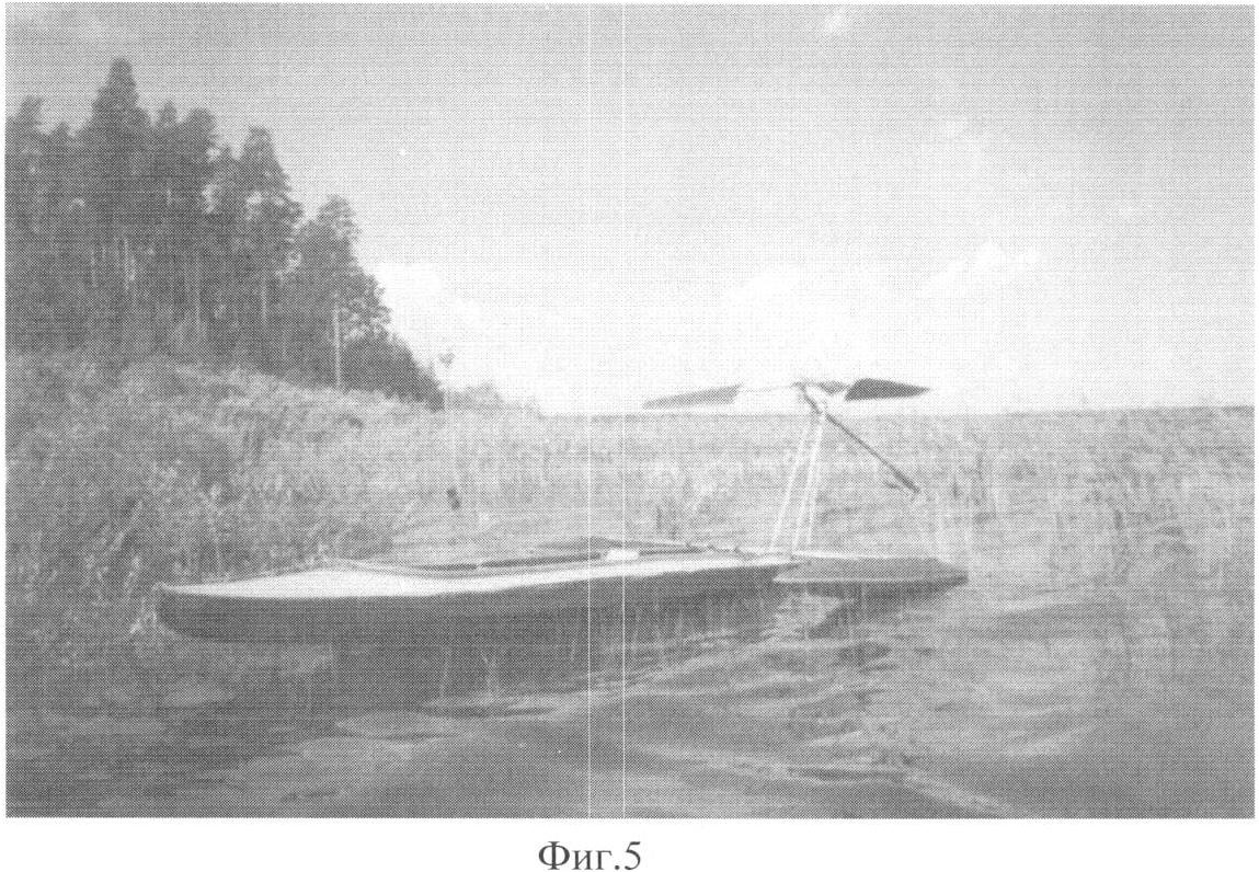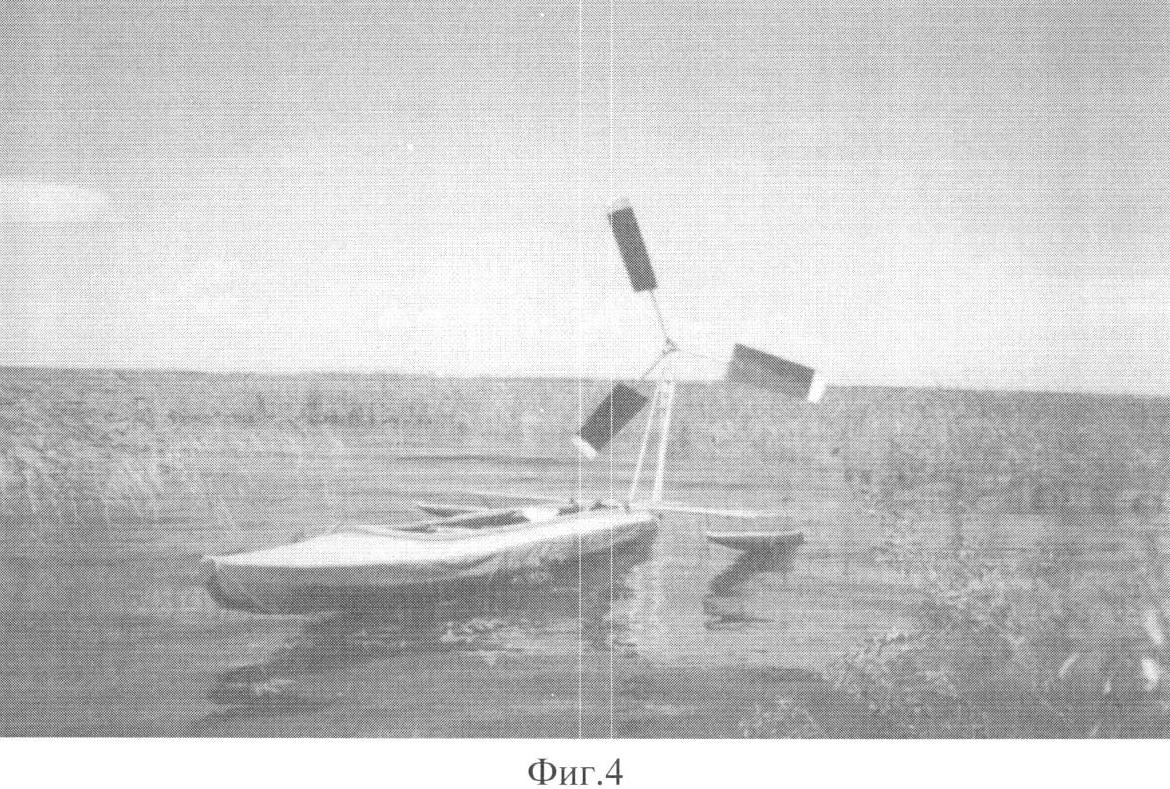 На фиг.4 изображен общий вид подвесного ветродвигателя с жесткими лопастями на байдарке.