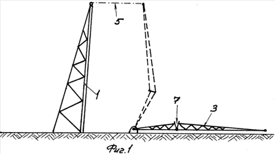 Вариант 3, где: 1 – стойки /видна только одна/, 2 – канат между ними, 3 – дополнительные стойки /пунктиром показаны в полуподнятом положении/, между концами которых имеется дополнительный канат 4, дополнительные стойки поднимаются тросами 5. Стойки 1 могут иметь поперечные растяжки 6. Дополнительные стойки могут иметь угловую форму или быть составными с помощью шарнира 7 с ограниченной подвижностью.