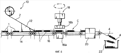 Преимущественно (и также в соответствии с критериями, известными сами по себе), рабочее место запечатывания 18 может быть выполнено так, чтобы осуществлять, помимо вертикальных перемещений, сводящих друг к другу матричную часть 18а и активный элемент 18b, между которыми расположена обертка, также перемещение, “отслеживающее” поступательное движение обертки. Это “отслеживающее” перемещение создает условия, при которых формирование герметизирующего шва 3 происходит практически без смещения запечатывающих средств относительно обертки.