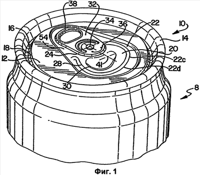 Далее, в этом варианте участок отрывного лепестка 20 в области 4:00-6:00 имеет больший радиус кривизны по сравнению с участком в области 6:00-8:00. Такая конструкция обеспечивает увеличенный радиус в переходной зоне 22d и увеличенную площадь поверхности отрывного лепестка 20 в области 6:00-8:00, чтобы было предусмотрено «большое отверстие» отрывного лепестка 20. Такой отрывной лепесток, обеспечивающий большое отверстие, иногда определяемое в уровне техники как отверстие с площадью по меньшей мере 0,5 кв. дюйма, обычно имеет резкий изгиб в области 5:00. Это является одним из существенных аспектов изобретения. Согласно изобретению обеспечен плавный разрыв бороздки в области 5:00 отрывного лепестка 20. Бороздка 22 в этой области находится ближе к точке 41, чем в области 6:00-9:00.