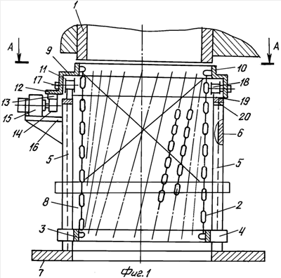 Затвор цепной действует следующим образом. При открытом затворе крупнокусковый груз свободно разгружается из устройства 1, не взаимодействуя с цепями 2, которые свободно провисают, будучи подвешенными к горизонтальной полке 9 верхнего кольца и имея слабину за счет увеличенной длины по сравнению с исходным расстоянием между верхним и нижним кольцами. Нижнее кольцо 3 в это время свободно опирается на основание 7. При необходимости перекрытия потока груза из выпускного устройства 1 тормоз 21 растормаживается и включается привод 15 поворота верхнего кольца, благодаря чему крутящий момент от шестерни 14 передается на зубчатый венец 13 верхнего кольца. Поворот верхнего кольца в горизонтальной плоскости в направлении 22 происходит при качении ходовых катков 18 по кольцевому рельсу 19. При повороте верхнего кольца подвешенные к нему круглозвенные цепи 2 начнут закручиваться относительно зафиксированного от вращения в горизонтальной плоскости нижнего кольца 3. При закручивании круглозвенных цепей 2 после выбора их слабины нижнее кольцо 3 начнет подниматься вверх, скользя своими выступами 4 по направляющим 5 кожуха 6. При этом направляющие 5 удерживают нижнее кольцо 3 от вращения, что и обеспечивает эффект закручивания цепей 2. При повороте верхнего кольца и закручивании круглозвенных цепей 2 в направлении 22 поток разгружаемого из устройства 1 крупнокускового груза постепенно сужается до полного перекрытия, после чего привод 15 отключается и затормаживается тормозом 21. Благодаря слабине цепей 2 в их исходном положении удается уменьшить высоту затвора за счет сокращения расстояния между верхними и нижними кольцами. Открытие затвора для выпуска груза осуществляют при включении привода 15 в обратном направлении, в результате чего при повороте верхнего кольца цепи 2 раскручиваются, а нижнее кольцо 3 опускается в исходное положение относительно направляющих 5. В исходном положении все цепи 2 занимают наклонное положение, соответствующее предварительному смещению точек крепления цепей 2 на верхнем кольце относительно нижнего кольца 3.
