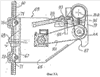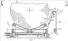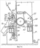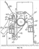 Штанга 23 установлена близко к нижним конца соответствующих, по существу, вертикальных рычагов сторон 19 и 21. Эти, по существу, вертикальные рычаги соединены наверху с наклонным рычагом, выполненным как единое целое с люлькой 11 челнока 9. В зоне схождения, соответствующей вершине перевернутой буквы V, обе стороны ограничивают пустое пространство – в целях, которые вскоре станут ясны. Несколько ниже зоны схождения двух рычагов 19 и 21 проходит ось 25 поворота, вокруг которой обеспечивается поворот пары полукруговых элементов 27 и 29, связанных с каждой стороной 19 и 21. К каждой паре полукруговых элементов 27 и 29 пары прикреплены ролики или стержни 31 и 33, связанные со сторонами 19 и 21, для управления качательным движением полукруговых элементов 25 и 27 в целях, которые станут ясными из нижеследующего описания.