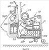 Символ В1 обозначает первую катушку, с которой разматывают первый материал N1 в виде ленты, для подачи его на поточную линию, расположенную дальше по технологической цепочке и в общем и целом обозначенную символом L. Положение рычагов 49 таково, что разматываемая катушка В1 несколько приподнята с челнока 9, который введен в пространство, ограниченное стойками 41 и 43, для перевода катушки В1 в правильное положение для захвата и подъема рычагами 49 и задними бабками, которые те несут. Поверхностный разматывающий элемент 110 удерживается своими собственными ремнями 117 в прижимном контакте с внешней поверхностью катушки В1, а электродвигатель 121, приводящий ремни 117 во вращение, вызывает это вращение и тем самым – разматывание катушки В1 для подачи материал N1 в виде ленты. Это вращение может также управляться в сочетании с центральным разматывающим элементом, связанным с рычагами 49, например, через посредство электродвигателя 99. Это, в частности, выгодно, когда катушка имеет малую плотность.