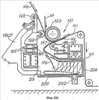 На анкерной балке 45 шарнирно закреплена относительно оси 137, параллельной направлению поступательного движения челнока 9, пара криволинейных качательных рычагов 139. Концы рычагов 139, противоположные тем, которые шарнирно закреплены на анкерной балке 45, служат опорой валику 141 (возможно – снабженному приводом), предназначенному для вступления в контакт с материалом в виде ленты для отклонения его траектории в течение фаз замены катушки, которая почти закончилась, полной катушкой, что будет подробнее пояснено позже. Криволинейные рычаги 139 образуют петлю, окружая ось катушки заканчивающейся катушки.