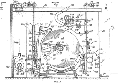 На фиг.1В ось катушки В1 в фазе подачи по-прежнему находится в том же положении, что и на фиг.1А, т.е. в положении, ограниченном осью В-В задних бабок 81 и 83 опоры, образованной рычагами 49. Поверхностный разматывающий элемент 110 повернут в направлении по часовой стрелке относительно предыдущего чертежа, чтобы остаться в контакте с катушкой и продолжить сообщение крутящего момента, необходимого для ее разматывания. Криволинейные рычаги 139 повернуты относительно предыдущего чертежа в направлении против часовой стрелки, а люлька 133 собирающего устройства оставлена в поднятом положении – непосредственно под анкерной балкой 45.