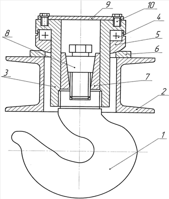 Крюк 1 удерживается в гайке 3 посредством резьбового соединения. Поворот крюка 1 относительно вертикальной оси осуществляется вместе с гайкой 3, которая фланцем через упорный подшипник 4 и сферическую поверхность шайбы 5 опирается на сферическую поверхность планки 6, приваренной к траверсе.