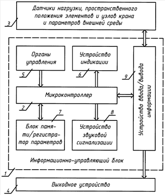 Устройство индикации 6 может быть размещено как в информационно-управляющем блоке 1, так и вне его. Оно может содержать как символьный, так и графический, например жидкокристаллический TFT, индикатор (дисплей) и/или светодиодные индикаторы. Устройство звуковой сигнализации 8 может также иметь различные варианты размещения на грузоподъемном кране и содержит акустический преобразователь (излучатель звука) с усилителем мощности (при необходимости, с синтезатором звуковых сигналов).