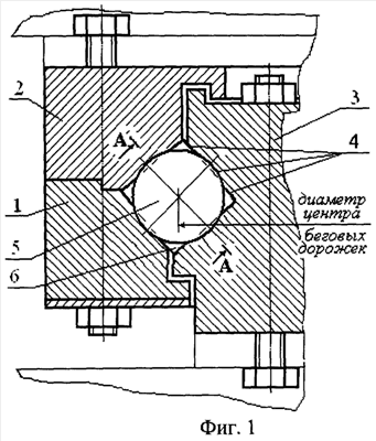 В широко применяемых конструкциях [1] опорно-поворотных кругов с крестообразно расположенными роликовыми телами качения беговые дорожки работают попарно в зависимости от нагрузки. Всего в передаче нагрузок в одном направлении может участвовать до 50% роликов от их общего количества в поворотном круге; из них только 25% роликов воспринимают нагрузку. Поэтому в большинстве случаев ролики опорно-поворотного круга, проработавшие 3…5 лет, имеют износ в виде кольцевой канавки по поверхности, по которой и происходит их разрушение. Одновременно образуются кольцевые выступы на поверхности беговых дорожек, что в совокупности приводит к выходу из строя опорно-поворотного круга. Это является недостатком известных конструкций опорно-поворотных кругов с роликовыми телами качения.