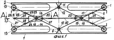 Каждая пара из короткой тяги 21 (22) и длиной тяги 24 (23) посредством оси 28 (29) размещена на верхнем и нижнем плечах перекрещивающихся рычагов 5, 6 основной пары 3 и рычагов 7, 8 дополнительной пары 4.