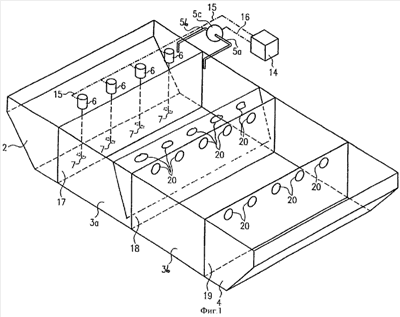 В секции 2 предварительного подкисления могут быть установлены мешалки 6, 7, посредством которых в этой секции 2 можно осуществлять перемешивание. Мешалки 6, 7 могут приводиться в действие управляющим устройством 14 при помощи сигнальных или питающих проводов 15. Управляющее устройство 14 посредством сигнального или питающего провода 16 может быть также соединено с насосом 5с, осуществляющим перемещение веществ по трубопроводам 5а и 5b из секции 2 предварительного подкисления в секцию основной нагрузки. На чертеже показано, что конец штуцера и трубопровода 5b размещены в верхней части секции 2 предварительного подкисления, т.е. выше среднего уровня секции 2. Секция 3а основной нагрузки, равно как и секция 3b низкой нагрузки, могут содержать разделительные стенки (не показаны). Двойная перегородка 18 между секцией 3а основной нагрузки и секцией 3b низкой нагрузки, а также перегородка 19 между секцией 3b низкой нагрузки и секцией 4 конечного отстаивания могут иметь пропускные или переливные отверстия 20, через которые вещества могут перемещаться из одной секции в другую.