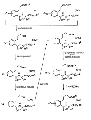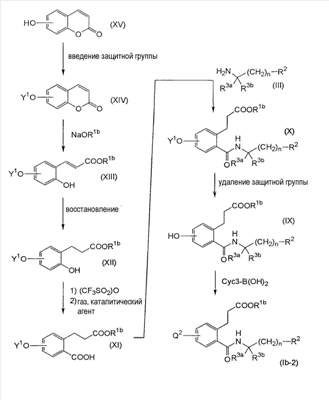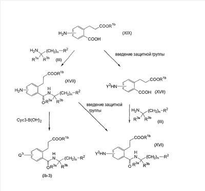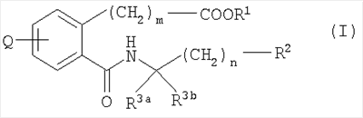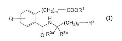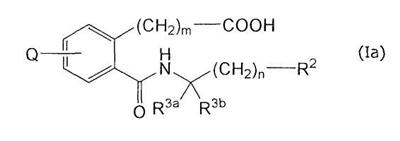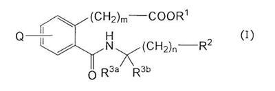 или его фармацевтически приемлемая соль. 2. Соединение карбоновой кислоты по п.1, которое представляет собой (1) 3-(4-(2,5-дифторфеноксиметил)-2-((((1R)-1-(нафталин-2-ил)этил)амино)карбонил)фенил)пропановую кислоту, (2) 3-(4-(2,5-дихлорфеноксиметил)-2-(((4-(3-метилфенил)тетрагидро-2Н-пиран-4-ил)амино)карбонил)фенил)пропановую кислоту, (3) 3-(4-(2-хлор-5-метилфеноксиметил)-2-(((4-(3-метилфенил)тетрагидро-2Н-пиран-4-ил)амино)карбонил)фенил)пропановую кислоту, (4) 3-(4-(2-хлор-5-фторфеноксиметил)-2-(((4-(3-метилфенил)тетрагидро-2Н-пиран-4-ил)амино)карбонил)фенил)пропановую кислоту, (5) 3-(4-(2,5-дифторфеноксиметил)-2-(((4-фенилтетрагидро-2Н-пиран-4-ил)амино)карбонил)фенил)пропановую кислоту, (6) 3-(4-(2,5-дихлорфеноксиметил)-2-(((4-фенилтетрагидро-2Н-пиран-4-ил)амино)карбонил)фенил)пропановую кислоту, (7) 3-(4-(2-хлор-5-фторфеноксиметил)-2-(((4-фенилтетрагидро-2Н-пиран-4-ил)амино)карбонил)фенил)пропановую кислоту, (8) 3-(4-(2,5-дифторфеноксиметил)-2-((((1R)-3-метил-1-(3-метилфенил)бутил)амино)карбонил)фенил)пропановую кислоту, (9) 3-(4-(3-цианфеноксиметил)-2-((((1R)-3-метил-1-(3-метилфенил)бутил)амино)карбонил)фенил)пропановую кислоту, (10) 3-(4-(2,5-диметилфеноксиметил)-2-((((1R)-3-метил-1-(3-метилфенил)бутил)амино)карбонил)фенил)пропановую кислоту, (11) 3-(4-(2,5-дифторфеноксиметил)-2-(((4-(нафталин-2-ил)тетрагидро-2Н-пиран-4-ил)амино)карбонил)фенил)пропановую кислоту, (12) 3-(4-(2,5-диметилфеноксиметил)-2-(((4-(3-метилфенил)тетрагидро-2Н-пиран-4-ил)амино)карбонил)фенил)пропановую кислоту, (13) 3-(4-(3-цианфеноксиметил)-2-(((4-(нафталин-2-ил)тетрагидро-2Н-пиран-4-ил)амино)карбонил)фенил)пропановую кислоту, (14) 3-(4-(2,5-диметилфеноксиметил)-2-(((4-(нафталин-2-ил)тетрагидро-2Н-пиран-4-ил)амино)карбонил)фенил)пропановую кислоту, (15) 3-(4-(5-фториндол-1-илметил)-2-((((1R)-1-(3,5-диметилфенил)-(3-метилбутил)амино)карбонил)фенил)пропановую кислоту, (16) 3-(4-(2,4-диметилфеноксиметил)-2-((((1R)-1-(3,5-диметилфенил)-3-метилбутил)амино)карбонил)фенил)пропановую кислоту, (17) 3-(2-(((4-(нафталин-2-ил)тетрагидро-2Н-пиран-4-ил)амино)карбонил)-4-феноксиметилфенил)пропановую кислоту, (18) 3-(2-(((4-(нафталин-2-ил)тетрагидро-2Н-пиран-4-ил)амино)карбонил)-4-(3-пиридилоксиметил)фенил)пропановую кислоту, (19) 3-(4-(3-хлорфеноксиметил)-2-(((4-(нафталин-2-ил)тетрагидро-2Н-пиран-4-ил)амино)карбонил)фенил)пропановую кислоту, (20) 3-(4-(3,4-диметилфеноксиметил)-2-((((1R)-1-(3,5-диметилфенил)-3-метилбутил)амино)карбонил)фенил)пропановую кислоту, (21) 3-(4-(2-хлор-5-фторфеноксиметил)-2-((((1R)-1-(3,5-диметилфенил)-3-метилбутил)амино)карбонил)фенил)пропановую кислоту, (22) 3-(2-((((1R)-1-(3,5-диметилфенил)-3-метилбутил)амино)карбонил)-4-(3-метилиндол-1-илметил)фенил)пропановую кислоту, (23) 3-(4-(2,5-дифторфеноксиметил)-2-((((1R)-1-(нафталин-1-ил)этил)амино)карбонил)фенил)пропановую кислоту, (24) 3-(4-(2-фтор-5-метилфеноксиметил)-2-((((1R)-1-(нафталин-1-ил)этил)амино)карбонил)фенил)пропановую кислоту, (25) 3-(2-(((4-(3,5-диметилфенил)тетрагидро-2Н-пиран-4-ил)амино)карбонил)-4-(2-фтор-5-метилфеноксиметил)фенил)пропановую кислоту, (26) 3-(4-(2-фтор-5-метилфеноксиметил)-2-(((4-(3-метилфенил)тетрагидро-2Н-пиран-4-ил)амино)карбонил)фенил)пропановую кислоту, (27) 3-(2-(((4-(бензофуран-2-ил)тетрагидро-2Н-пиран-4-ил)амино)карбонил)-4-(2,5-дифторфеноксиметил)фенил)пропановую кислоту, (28) 3-(2-((((1R)-1-(3,5-диметилфенил)-3-метилбутил)амино)карбонил)-4-(4-фтор-2-метилфеноксиметил)фенил)пропановую кислоту, (29) 3-(2-((((1R)-1-(3,5-диметилфенил)-3-метилбутил)амино)карбонил)-4-((2-метилпиридин-3-ил)оксиметил)фенил)пропановую кислоту, (30) 3-(2-((((1R)-1-(3,5-диметилфенил)-3-метилбутил)амино)карбонил)-