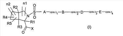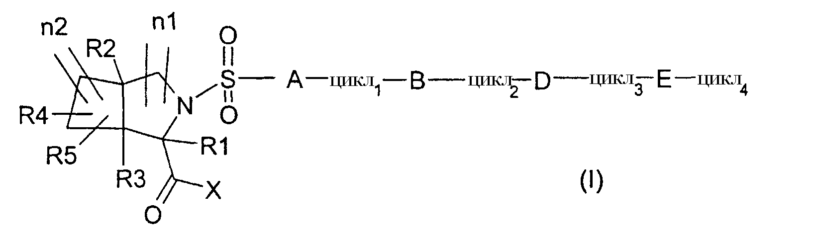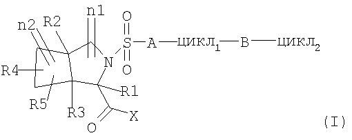и/или все стереоизомерные формы соединения формулы (I), и/или смеси этих форм в любом соотношении, и/или физиологически приемлемая соль соединения формулы (I), причем А означает -(С0-С4)-алкилен; В означает -(С0-С4)-алкилен или остаток -В1-В2-В3-, где В1 означает -(СН2)n-, где n означает целое число ноль; В3 означает -(СН2)m-, где m означает целое число ноль; с тем соответствием, что сумма n и m составляет ноль; и В2 означает -О-; цикл 1 или цикл 2 являются одинаковыми или разными и, независимо друг от друга, означают 1) ковалентную связь, 2) -(С6-С14)-арил, который является ароматическим углеводородным остатком с 6-14 атомами углерода в цикле, где указанный арил незамещен или, независимо друг от друга, однозамещен с помощью G, или 3) 4-15-членный гетероцикл, который является циклической системой с 4-15 атомами углерода, которые находятся в одной, двух или трех связанных друг с другом циклических системах и которая содержит одни гетероатом, выбранный из азота или кислорода, где указанный гетероцикл незамещен или, независимо друг от друга, однозамещен с помощью G; G означает 1) атом водорода, 2) атом галогена, 3) -O-R12, где R12 означает а) атом водорода, b) -(С1-С6)-алкил, где алкил незамещен или трехкратно замещен атомом галогена, c) -C(O)-O-R13, где R13 означает с) 1)-(С1-С6)-алкил, где алкил незамещен, 4) -NO2, 5) -CN, 6) -N(R15)-R12, где R15 означает 6) 1) атом водорода, X означает -ОН или -NH-OH; n1 означает целое число 2; n2 означает целое число 3; с тем соответствием, что сумма n1 и n2 составляет 5; R1, R2, R3, R4 и R5 являются одинаковыми или разными и, независимо друг от друга, означают 1) атом водорода, 2) -C(O)-R8, где R8 означает 2) 1) атом водорода, 2) 2)-(С1-С6)-алкил, где алкил незамещен. Также изобретение относится к способу получения соединений формулы (I) и к лекарственному средству для ингибирования матриксных металлопротеаз. Технический результат: получены новые производные насыщенных бициклических иминокислот, обладающие полезными биологическими свойствами. 3 н. и 1 з.п. ф-лы, 3 табл.