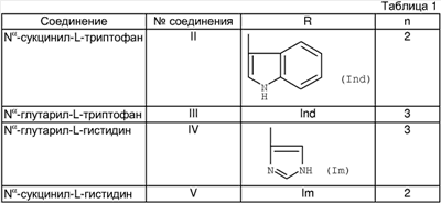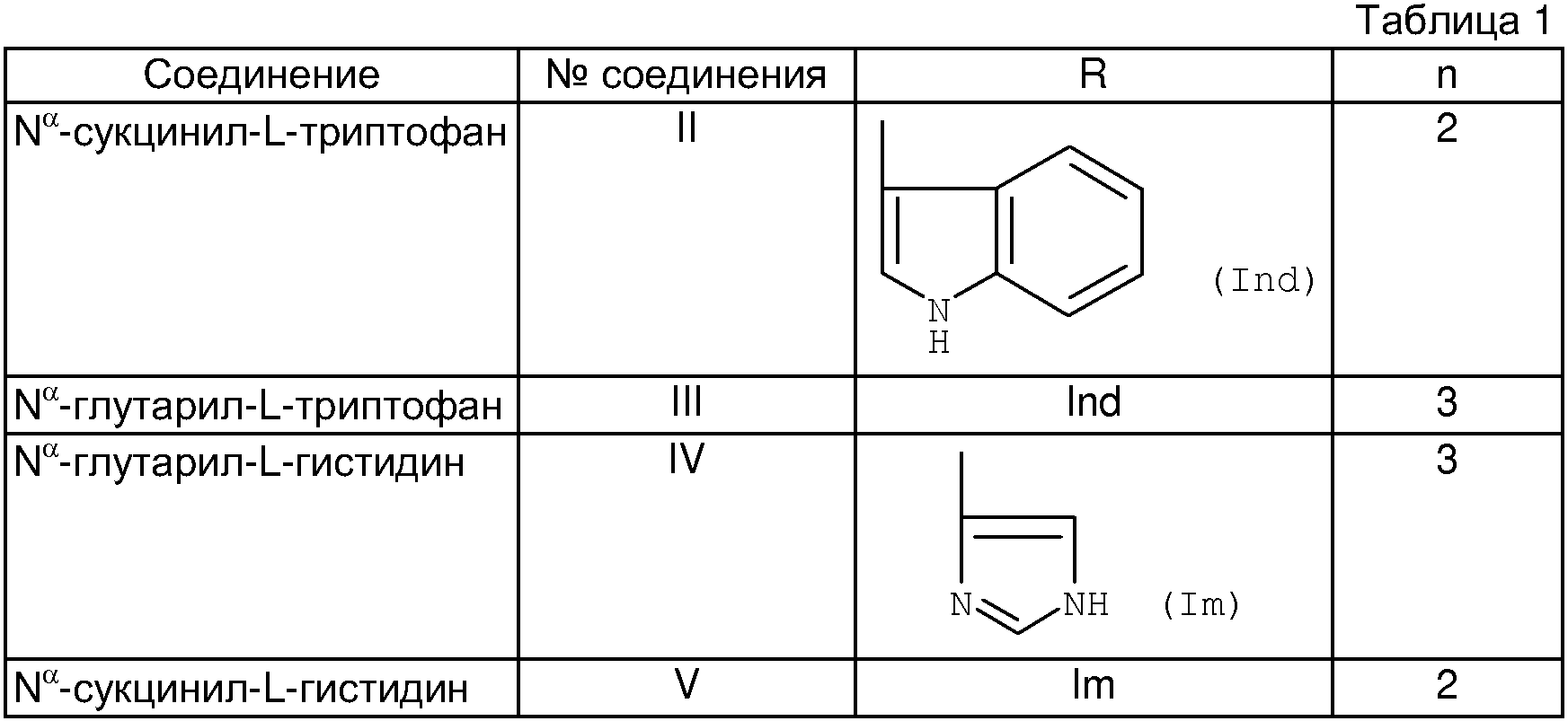 Так, под общую формулу (I) вышеуказанной международной заявки подпадают соединения настоящего изобретения N -сукцинил-L-триптофан (II), N -глутарил-L-триптофан (III), N -глутарил-L-гистидин (IV) и N -сукцинил-L-гистидин (V). Однако в указанной публикации не приведены ни конкретные структурные формулы данных соединений, ни какие-либо физико-химические характеристики, а также не описаны способы их получения. В публикации международной заявки WO 03/072124 приведены формулы N -глутарил-L-триптофана (II), N -глутарил-L-гистидина (IV) и N -сукцинил-L-гистидина (V), но не описан способ их синтеза и не приведены их физико-химические константы.