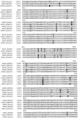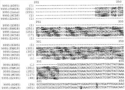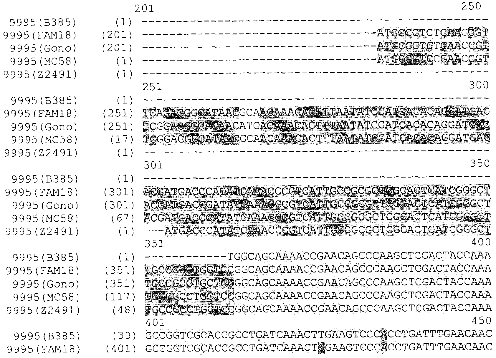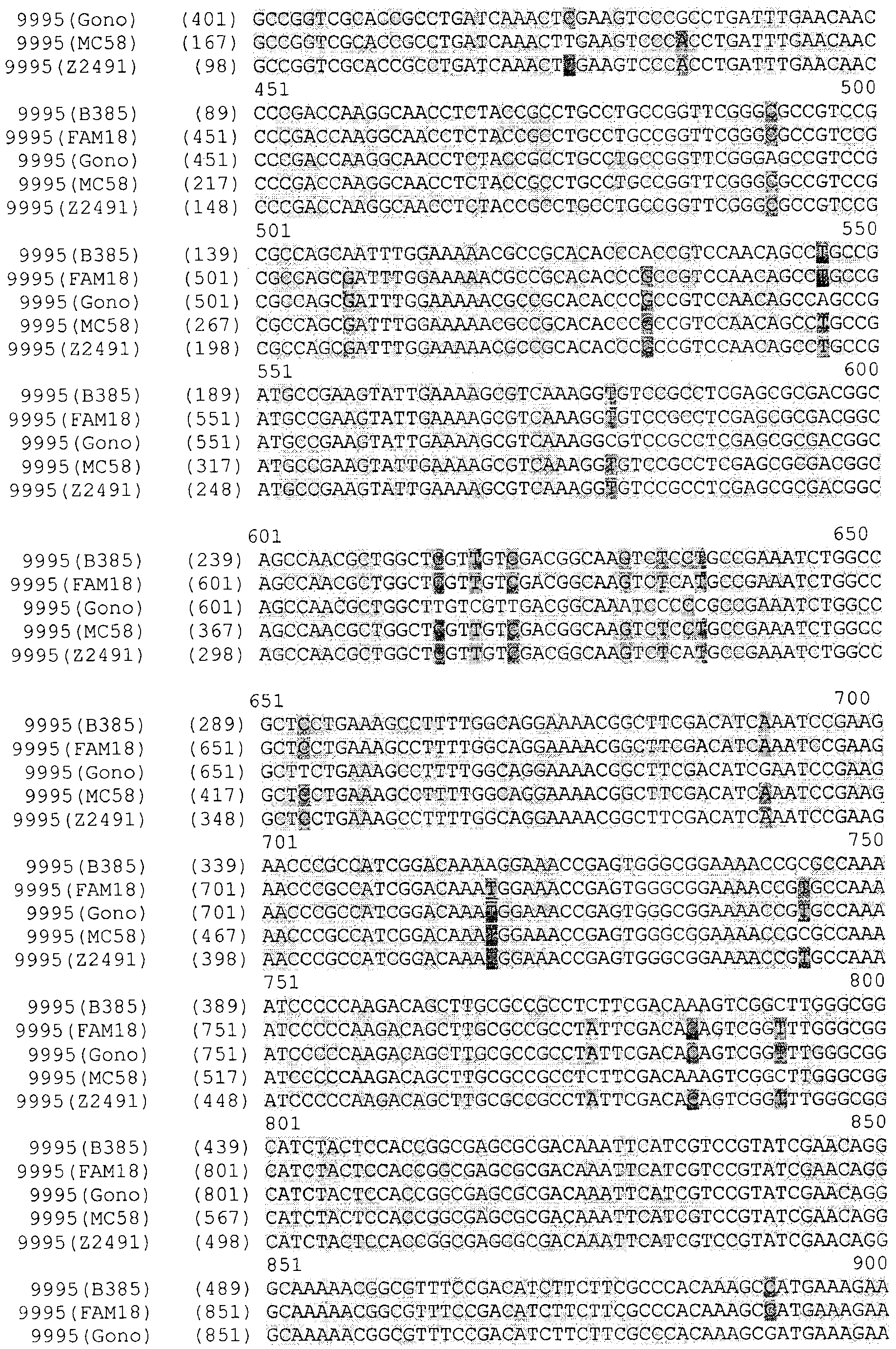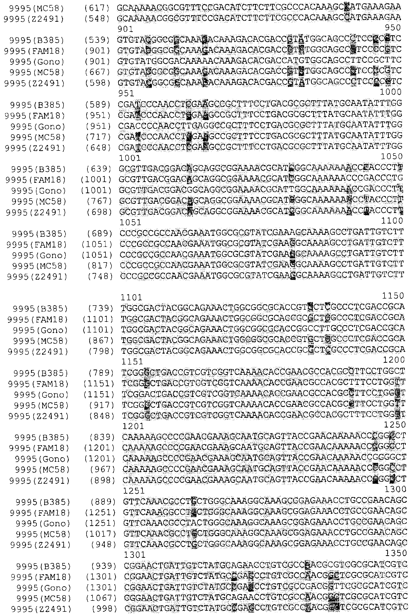 Прежде всего было выполнено выравнивание генов NMB0928 Neisserial. Последовательности были взяты из опубликованных данных по геномам Neisseria. Выравнивали следующие последовательности: Neisseria meningitidis MC58, Neisseria meningitidis Z2491, Neisseria meningitidis FAM18, Neisseria gonorrhoeae FA1090. Ниже представлены результаты выравнивания, из которых следует, что высокая степень гомологии наблюдается не только между генами, обнаруживаемыми в нескольких штаммах N.meningitidis, но также и между генами, обнаруживаемыми в штаммах N.meningitidis и N.gonococci. Соответственно, антиген NMB0928 можно расценивать – а также исследовать – в качестве защитного антигена для борьбы с заболеваниями, вызываемыми целым рядом разных штаммов, относящихся к одному и тому же роду бактерий