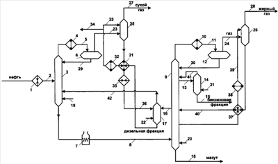 Нефть нагревают в теплообменниках 1 и по линии 2 вводят в первую колонну 3. Пары с верха колонны 3 частично конденсируют и охлаждают в конденсаторах-холодильниках 4 и по линии 5 подают в емкость орошения 6. Остаток колонны 3 нагревают в печи 7 и по линии 8 вводят во вторую колонну 9. Пары с верха колонны 9 частично конденсируют и охлаждают в конденсаторах-холодильниках 10, а затем по линии 11 вводят в емкость орошения 12. Верхний боковой погон колонны 9 по линии 13 подают на верх верхней отпарной секции 14. С низа отпарной секции 14 по линии 15 выводят бензиновую фракцию. Нижний боковой погон колонны 9 по линии 16 подают на верх нижней отпарной секции 17. С низа колонны 9 по линии 18 выводят мазут. В низ колонн 3 и 9 и отпарных секций 14 и 17 соответственно по линиям 19, 20 21 и 22 подают нагретые потоки. С верха емкостей 6 и 12 по линиям 23 и 24 выводят газы и подают соответственно в низ абсорберов 25 и 26. С верха абсорберов 25 и 26 соответственно по линиям 27 и 28 выводят сухой и жирный газы. Легкие бензиновые фракции с низа емкостей 6 и 12 соответственно по линиям 29 и 30 возвращают в качестве орошения колонн 3 и 9. Дизельную фракцию с низа отпарной секции 17 охлаждают в теплообменниках 31, холодильнике 32 и по линии 33 подают на верх абсорбера 25, а балансовый избыток выводят по линии 34. Остаток абсорбера 25 нагревают в теплообменниках 31 и 35 и по линии 36 подают на верх отпарной секции 17. Из колонны 9 выводят нижнее циркуляционное орошение, охлаждают в теплообменнике 37 и холодильнике 38 и по линии 39 подают на верх абсорбера 26. Остаток с низа абсорбера 26 нагревают в теплообменнике 37 и по линии 40 возвращают в колонну 9. Пары с верха отпарных секций 14 и 17 соответственно по линиям 41 и 42 подают в колонны 9 и 3.