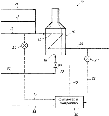 Для управления жесткостью процесса крекинга на компьютер и контроллер 30 по линии 38 подается определенная величина, называемая заданной точкой, для требуемого отношения водорода к углероду жидкой фракции. Компьютер и контроллер 30 обрабатывают информацию, получаемую по линии 32, линии 36 и линии 38, для расчета величины отношения водорода к углероду жидкой фракции. Дифференциальная величина между действительным отношением водорода к углероду жидкой фракции и требуемым отношением водорода к углероду жидкой фракции вычисляется компьютером и контроллером 30, которые выдают выходной сигнал, представляющий дифференциальную величину, подаваемый по линии 40 на управляющий вентиль 22. Управляющий вентиль 22 регулируется в соответствии со входным сигналом от линии 40, чтобы тем самым изменять ввод тепла в печь 16 для термического крекинга и таким образом жесткость крекинга и в конечном счете получать жидкую фракцию, имеющую требуемое отношение водорода к углероду.