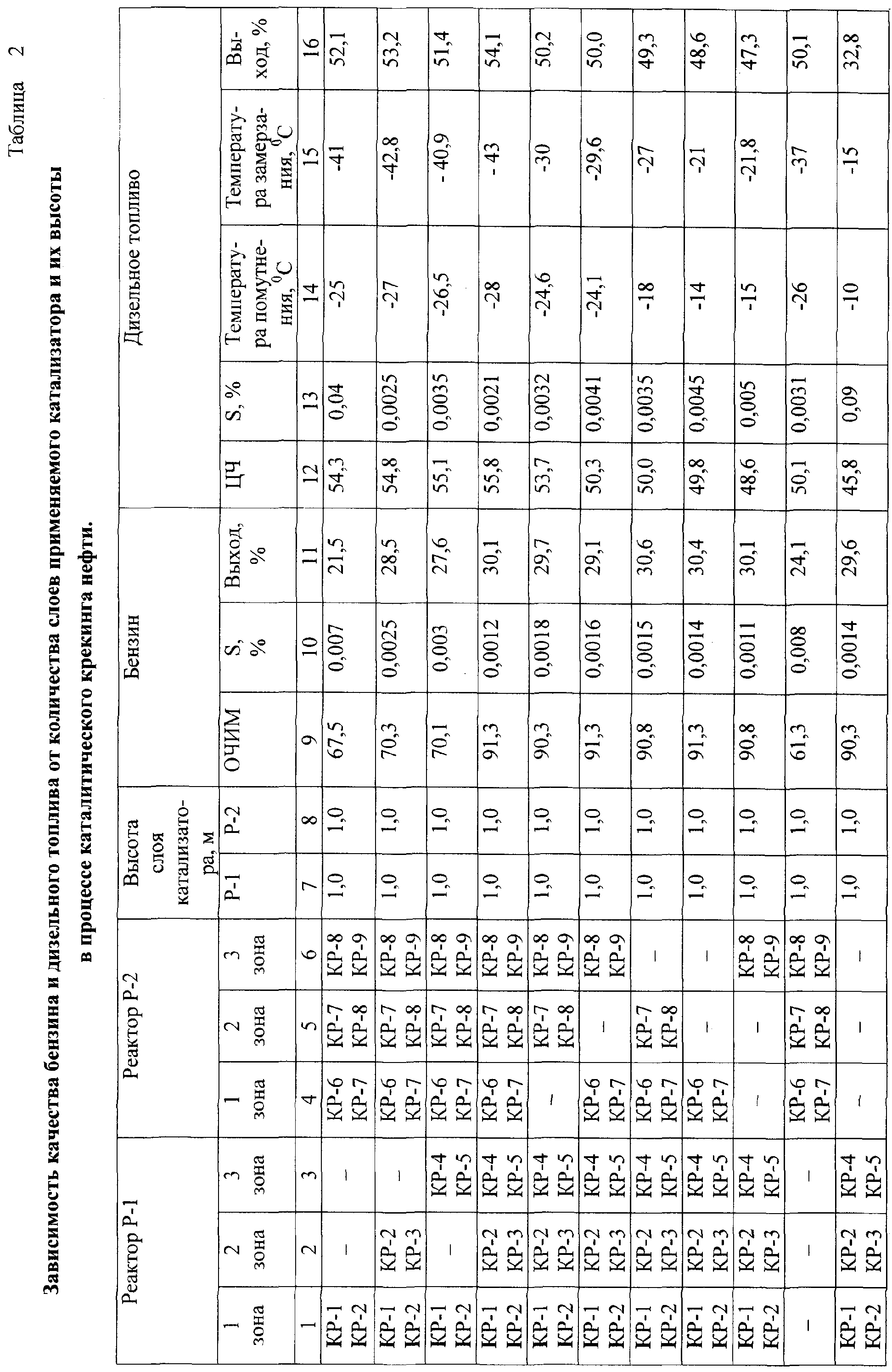 Кубовый остаток из Р-1, содержащий дизельное топливо и мазут с температурой 190-195°С, поступает самотеком в Р-2 в 1-й слой смеси цеолитсодержащих катализаторов КР-6 и КР-7, где в пленочном режиме и температуре 330-350°С нефтяного сырья проходит крекинг на катализаторах КР-6 и КР-7, а затем в жидкофазной среде в кубе Р-2 проходит глубокий крекинг его на катализаторах КР-7 и КР-8 при температуре 350-370°С.