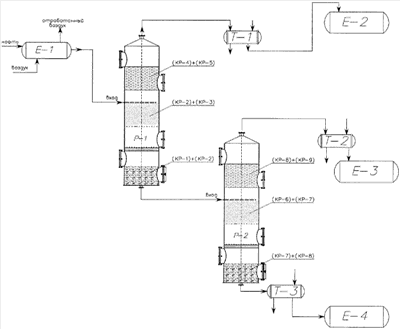 Процесс жидкофазного каталитического окислительного крекинга кубового нефтяного остатка реактора Р-1 в начале протекает в пленочном режиме на поверхности первого слоя цеолитсодержащего катализатора (КР-6 и КР-7), а затем во втором слое катализатора (КР-7 и КР-8), который находится в толще нефтяного сырья, где протекают более глубокие процессы изомеризации с образованием реакционного водорода, гидрокрекинга, депарафинизации, гидрогенолиза, ароматизации образовавшихся низкомолекулярных олефинов и окисления сернистых соединений до SO3 2- и S2O3 2-.