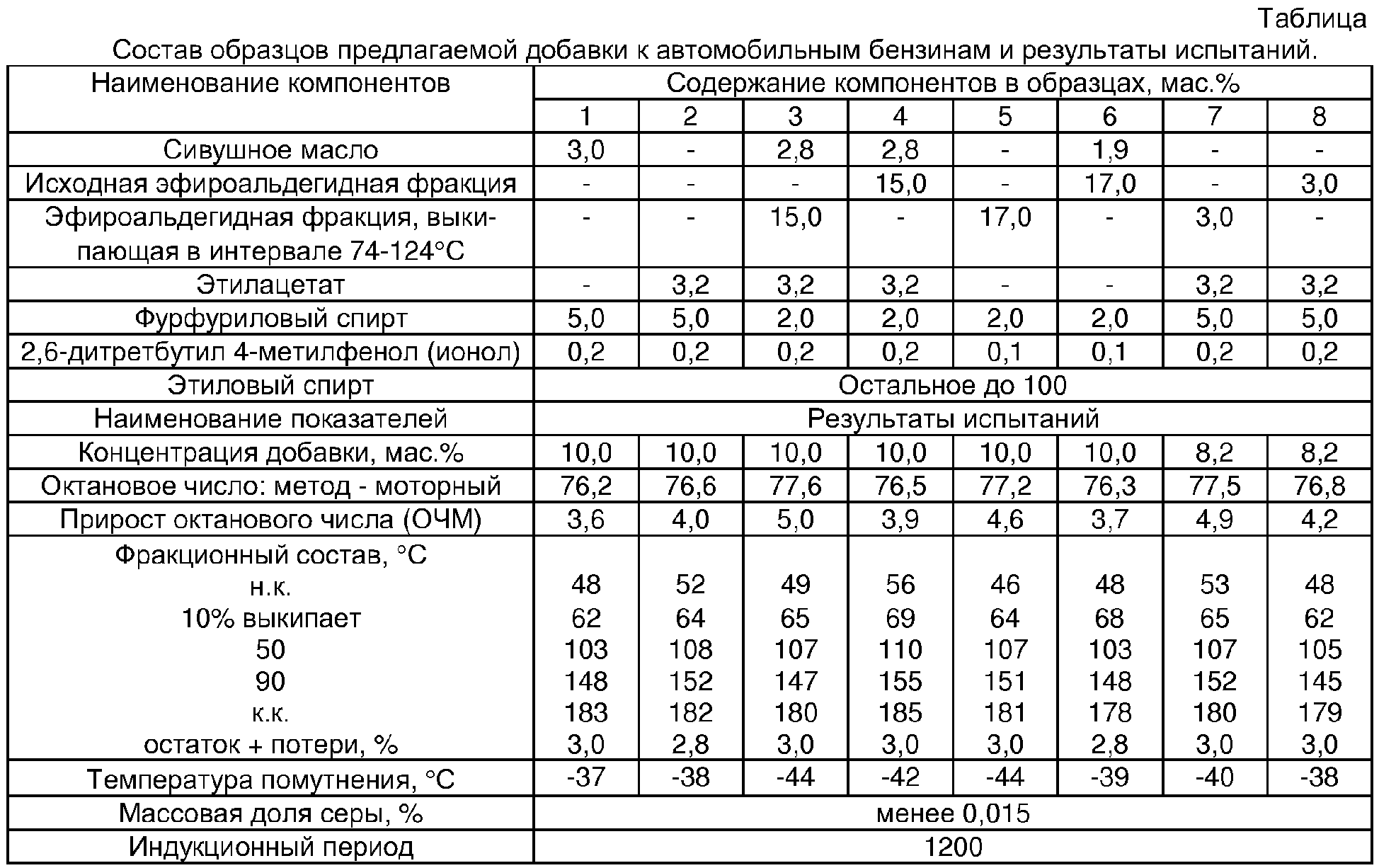 Причем добавка содержит сорастворитель, выбранный из группы: метилацетат, этилацетат, эфироальдегидная фракция, сивушное масло или их смесь. Предпочтительно добавка содержит эфироальдегидную фракцию, выкипающую в интервале 74-124°С. В качестве антиоксиданта добавка содержит экранированные фенолы или бис-фенолы. Отличия заявляемого технического решения состоят в том, что добавка дополнительно содержит фурфуриловый спирт, а также в соотношении компонентов. Проведенный анализ известных технических решений показал, что предлагаемая совокупность компонентов является новой, так как фурфуриловый спирт в качестве октаноповышающего оксигената в составе добавки к бензину предлагается использовать впервые. Совместное использование в составе добавки этилового спирта, фурфурилового спирта и сорастворителя, предпочтительно, эфироальдегидной фракции, выкипающей в интервале 74-124°С, позволяет значительно повысить антидетонационные свойства добавки. Предлагаемая добавка при использовании ее в составе автомобильных бензинов обеспечивает им высокие антидетонационные свойства, высокую фазовую стабильность при низких температурах при длительном хранении, а также улучшенные экологические характеристики. Предлагаемую добавку готовят смешением компонентов по безотходной технологии с использованием доступных продуктов промышленного производства. Ниже приведены характеристики компонентов, используемых для приготовления образцов предлагаемой добавки. В качестве этилового спирта используют технический ректификованный этиловый спирт, произведенный по ГОСТ 18300-87. Масло сивушное является побочным продуктом ректификации этилового спирта, выпускается по ГОСТ 17071-91 и представляет собой смесь спиртов: амиловых, изобутилового, н-пропилового и этилового. Кроме того, масло сивушное содержит незначительное количество других органических соединений. Эфироальдегидная фракция с пределами выкипания 74-124°С получена из головной фракции эфирной колонны производства этилового спирта из растительного сырья, которую сначала подвергают обезвоживанию, а затем фракционированию при атмосферном давлении. Фурфуриловый спирт имеет степень чистоты 98,5%. Этилацетат является продуктом промышленного производства, при использовании в составе добавки специально приготовленного метилацетата достигается аналогичный результат. В качестве антиоксиданта в состав образцов добавки вводили 2,6-дитрет-бутил 4-метилфенол (ионол), но могут быть использованы и другие известные антиоксиданты фенольного типа. Для иллюстрации существа заявленного технического решения было приготовлено 8 образцов добавки. Предлагаемая добавка вводится в состав бензинов в количестве до 10 мас.%. Приготовленные образцы добавки были испытаны в составе базового бензина, представляющего собой смесь высокооктанового компонента – риформата установки каталитического риформинга с октановым числом 85 пунктов по моторному методу, выкипающего в пределах 86-180°С, и прямогонной бензиновой фракции установки атмосферно-вакуумной перегонки с октановым числом 56,7 пунктов и температурными пределами выкипания 40-178°С. Ферганского НПЗ. Базовый бензин имел октановое число по моторному методу, равное 72,6 пунктов. Антидетонационные свойства оценивали по ГОСТ 511-82 на установке УИТ-85. Фазовую ст