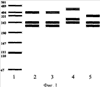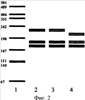 На фигурах 1 и 2 представлен SSCP-анализ продуктов амплификации гена MTRNR1. Фигура 1. SSCP-анализ участка 1 гена MTRNR1. Дорожка 1 – молекулярный маркер pUC19/Pstl; дорожка 2 – образец, содержащий мутацию Т1095С, дорожки 3, 4 – образцы, содержащие мутацию del961TinsCn, дорожка 5 – образец с нормальной последовательностью ДНК. Фигура 2. SSCP-анализ участка 2 гена MTRNR1. Дорожка 1 – молекулярный маркер pUC19/Pstl; дорожка 2 – образец, содержащий мутацию A1555G в состоянии гомоплазмии, дорожка 3 – образец, содержащий мутацию A1555G в состоянии гетероплазмии, дорожка 4 – образец, содержащий мутацию C1494T.