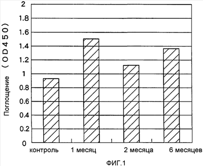 Все лунки 96-луночного планшета (Nunc, MaxiSorp) обрабатывали A 1-42-пептидом (5 мг/мл) и блокировали 5%-ным раствором обезжиренного сухого молока в буфере TBS-T, после чего добавляли вышеописанные пробы сывороток крови экспериментальных мышей (в 500-кратном разведении) и выполняли определение при помощи меченных пероксидазой IgG против мышиных иммуноглобулинов. Титр антител определяли путем измерения оптического поглощения на ELISA-ридере. Результаты приведены на Фигуре 1.