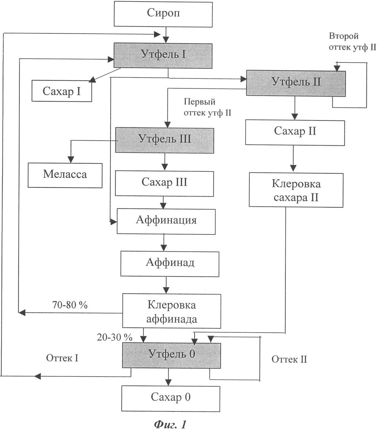 Сахар-сырец с поляризацией 98,6% вводят в производство в количестве 5 кг на 100 кг свеклы, аффинируют первым оттеком утфеля I кристаллизации, разбавленным до СВ 76%, после центрифугирования аффинационного утфеля получают сахар-аффинад и два оттека. Сахар аффинад клеруют до СВ 68%, клеровку вместе с клеровкой желтого сахара II кристаллизации подвергают сульфитации и фильтрованию. Смесь клеровок направляют на уваривание утфеля 0 кристаллизации. Сваренный утфель 0 кристаллизации имеет чистоту 98,8%, его центрифугируют с получением сахара рафинадного достоинства и двух оттеков. Первый оттек утфеля 0 кристаллизации подают на уваривание утфеля I кристаллизации, а второй оттек возвращают на последние подкачки «на себя». Утфель I кристаллизации уваривают из сиропа с СВ 68%, полученного из сахарной свеклы, первого оттека утфеля 0 кристаллизации и второго оттека утфеля I кристаллизации, утфель I кристаллизации имеет чистоту 94,9%, после центрифугирования утфеля I кристаллизации получают белый сахар стандартного качества и два оттека, первый оттек подают на аффинацию сахара-сырца и на уваривание утфеля II кристаллизации, а второй оттек – 30% возвращают «на себя», а 70% направляют на приготовление кристаллической основы. Утфель II кристаллизации уваривают на кристаллической основе, приготовленной из желтого сахара III кристаллизации и второго оттека утфеля I кристаллизации, при уваривании утфеля II кристаллизации подкачивают первый оттек утфеля I кристаллизации, второй оттек утфеля II кристаллизации и второй аффинационный оттек после центрифугирования аффинационного утфеля из сахара-сырца, утфель II кристаллизации при выгрузке имеет чистоту 86,5%, при центрифугировании утфеля II кристаллизации получают желтый сахар II кристаллизации и два оттека, желтый сахар клеруют до СВ 68%, клеровку после сульфитации и фильтрования вместе с клеровкой аффинада направляют на уваривание утфеля 0 кристаллизации. Утфель III кристаллизации (Ч=74,6%) варят из первого оттека утфеля II кристаллизации и первого аффинационного оттека, далее утфель III кристаллизации подвергают кристаллизации охлаждением и центрифугированию с получением желтого сахара III кристаллизации и одного оттека – мелассы, желтый сахар III кристаллизации смешивают со вторым оттеком утфеля I кристаллизации, полученную кристаллическую основу с СВ 84% и чистотой 93% используют для уваривания утфеля II кристаллизации.