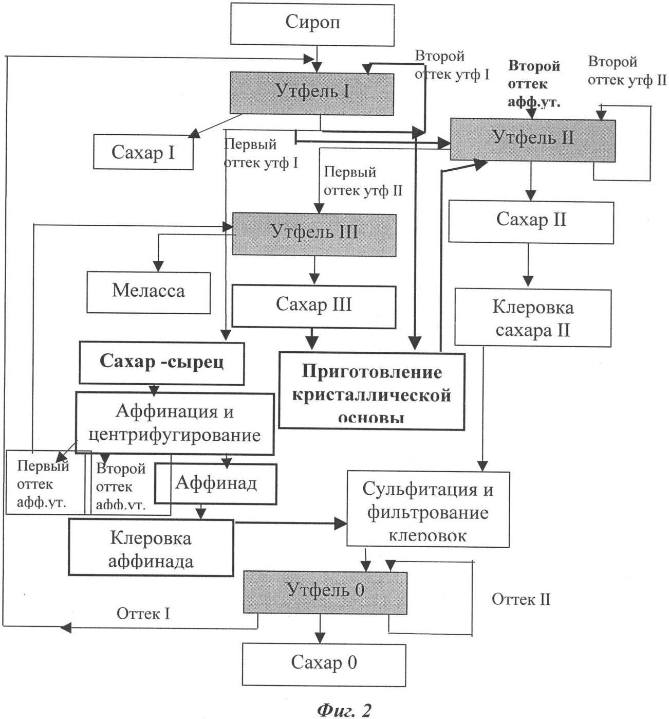 Технический результат достигается тем, что в предложенном способе производства сахара, предусматривающем уваривание утфеля 0 кристаллизации из клеровки желтого сахара II кристаллизации и второго оттека утфеля 0 кристаллизации, центрифугирование последнего с получением сахара рафинадного достоинства и двух оттеков, уваривание утфеля I кристаллизации из свеклосахарного сиропа и первого оттека утфеля 0 кристаллизации, центрифугирование утфеля I кристаллизации с получением белого сахара и двух оттеков, уваривание утфеля II кристаллизации, его центрифугирование с получением желтого сахара II кристаллизации и двух оттеков, уваривание утфеля III кристаллизации, его кристаллизацию охлаждением и центрифугирование с получением желтого сахара III кристаллизации и мелассы; готовят сульфитированную и отфильтрованную клеровку аффинированного сахара-сырца, используемого в количестве 5-10 кг на 100 кг свеклы, и эту клеровку направляют на уваривание утфеля 0 кристаллизации, при этом уваривание утфеля II кристаллизации осуществляют на кристаллической основе, приготовленной из желтого сахара III кристаллизации и второго оттека утфеля I кристаллизации.