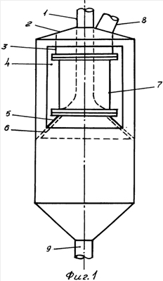 Известен пылеуловитель сухой очистки в виде вертикального резервуара с коническими торцами, патрубками для поступления пылегазовой смеси, вывода газа для тонкой очистки и выпуска пыли (1). Эффективность осаждения пыли в этом пылеуловителе 50-80%, что является его существенным недостатком.