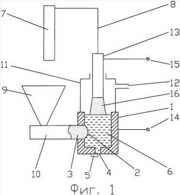 Устройство, представленное на фиг.1, содержит в качестве примера медный водоохлаждаемый тигель 1 с боковым отверстием 2 для ввода шихты 3 и донным отверстием 4 с запорным устройством 5 для выпуска расплава 6, источник 7 восстановительного газа с трубопроводом 8, бункер 9 с шихтой, шнековое средство подачи шихты 10, свод 11 с отверстием 12 для отходящего газа, графитовый электрод 13. Подвод электроэнергии осуществляют к тиглю 1 и электроду 13 через клеммы 14 и 15, плазменная дуга 16 горит между расплавом 6 и электродом 13. Количество отверстий 2 должно быть не менее двух на противоположных стенках тигля.