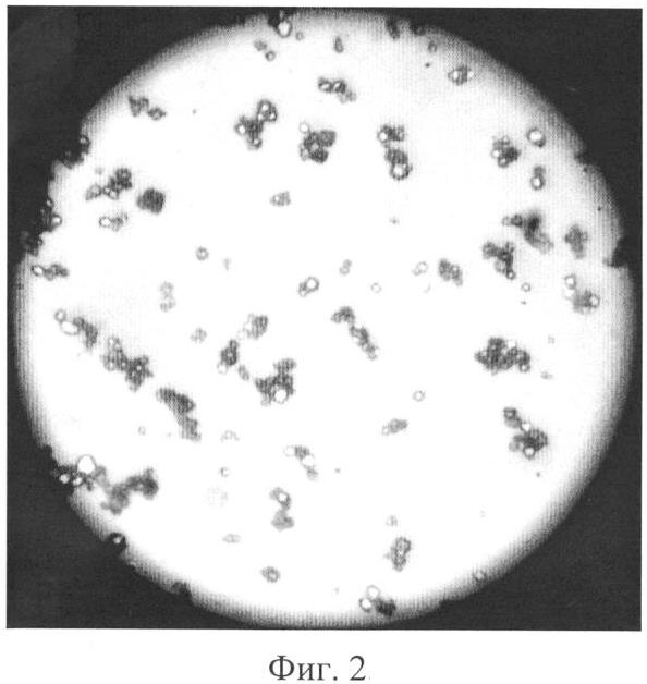 Монокристаллы высокодисперсных алмазов могут быть выделены из материала, например химическим растворением металлов в смесях кислот. На Фиг.2 приведена фотография, полученная с помощью оптического микроскопа при увеличении х900 монокристаллов алмазов, извлеченных из материала, полученного, как описано в примере 1, размер кристаллов алмаза 0,2-2 мкм.
