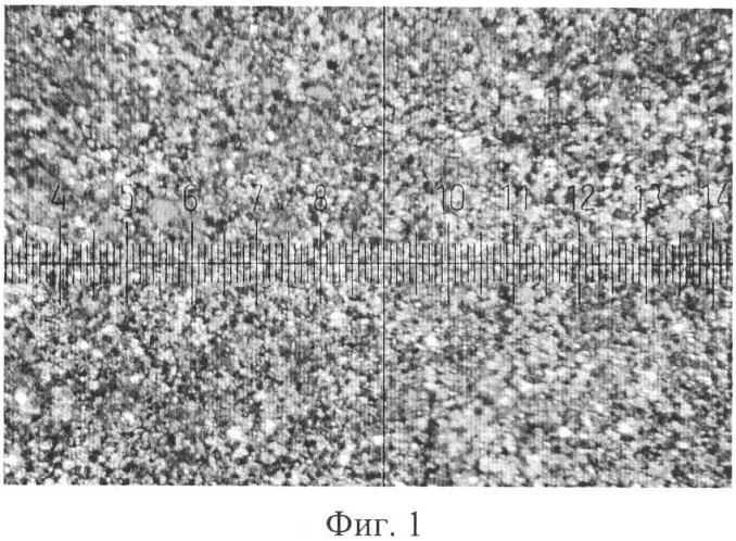 На Фиг.1 показана фотография скола алмазосодержащего материала, полученная с помощью оптического микроскопа при увеличении х900, на которой видна высокая однородность распределения в нем монокристаллов алмаза 0,2-2 мкм. Материал был получен, как описано в примере 1.