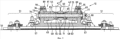 Каждая деталь 63 поперечины наружной боковой стороной опирается на внутреннюю сторону соответствующего пяточного элемента 35, 36, а внутренней боковой стороной – на наружную боковину шейки 46 соответствующего рельса 43, 44.