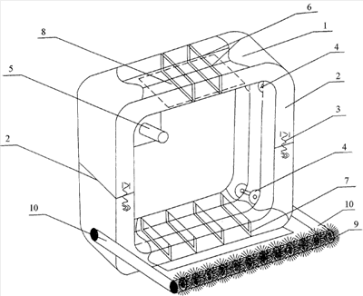Сзади силового каркаса 1, параллельно его продольной оси, закреплена роторная подметальная щетка 9, снабженная двигателем (не показан) и имеющая механизм 10 для подъема щетки 9 из рабочего (нижнего) в транспортное (верхнее) положение.