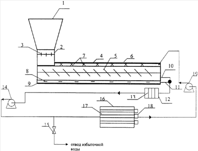 На чертеже показаны: 1 – приемный бункер, 2 – устройство для измельчения снега, 3 – фреза, 4 – снегоплавильная камера, 5 – один из шнеков, 6 – слой теплоизоляции, 7 – сопла, 8 – щелевые отверстия, 9 – поддон, 10 – трубопровод для отвода воды, 11 – трубопровод для подачи воды в устройство для сбора твердых бытовых отходов, 12 – устройство для сбора твердых бытовых отходов, 13 – решетка, 14 – насос, 15 – задвижка, 16 – теплообменник, 17 – трубы теплообменника, 18 – форсунки, 19 – насос.