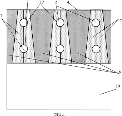 Жесткие слои 1 выполнены толщиной 40-60 мм из бетона, армированного металлической арматурой 5, и скреплены друг с другом с зазором 3, не превышающим толщину слоев 1 (шириной 3-20 мм), посредством жестких перемычек 2. Внешние слои стены могут быть выполнены из бетона, с добавками (или покрытиями), обеспечивающими повышение их эксплуатационных свойств (повышенной прочности, пониженного водопоглощения) и/или декоративности поверхности. Жесткие перемычки 2 выполнены с возможностью их работы на сжатие и растяжение (число перемычек от 2 до 8, они выполнены из материала, соответствующего материалу слоев 1, снабжены армировкой, имеют поперечный размер 30-100 мм, в зависимости от размеров пластин 1). Перемычки 2 размещены в соседних зазорах не соосно, их местоположение в соседних зазорах 3 не совпадает друг с другом. По меньшей мере один из зазоров 3 заполнен теплоизоляционным материалом 11, например сыпучим или выполненным в виде теплоизоляционного вкладыша (конструктивно и по толщине, соответствующего вкладышу 4, используемому для формирования зазора 3). Вкладыши выполнены из пластика или металла или дерева. Они включают формовочные элементы 7 (предназначенные для формирования перемычек) и распорные элементы 8, обеспечивающие фиксацию формовочных элементов 7. Их толщина соответствует ширине формируемого зазора. Формовочные элементы 7 выполнены в виде специальных замкнутых пустотных вкладышей, полость которого заполняется воздухом или жидкостью или досок или пластмассы, трапециевидной формы, одна боковая сторона которых вертикальна, а другая составляет с нижним основанием острый угол (порядка 80-85°). При этом вертикальная сторона снабжена вырезами 12, совпадающими с вырезами контактирующей с ней стороны второго формовочного элемента 7. Распорные элементы 8 выполнены в форме равнобедренной трапеции, наклон боковых сторон которой соответствует наклону соответствующих боковых сторон формовочных элементов 7.