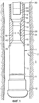 На фиг.1 схематически показана скважинная колонна 1 в сборе согласно изобретению, когда она расположена в стволе 2 скважины, проходящем в подповерхностный пласт 3. На фиг.1 нижняя часть 5 скважинной колонны показана присоединенной к верхней части 8 скважинной колонны. Нижняя часть 5 скважинной колонны имеет верхний конец 10 и нижний конец 11, и на нижнем конце в данном случае присоединено обычное буровое долото 12. Нижняя часть 5 скважинной колонны также может включать секцию обычной бурильной трубы, а также другие элементы оборудования низа бурильной колонны, такие как утяжеленная бурильная труба, устройства для регулирования направления, забойный турбинный двигатель, систему (непоказанную) для скважинных исследований в процессе бурения. Отсутствует необходимость в том, чтобы нижняя часть скважинной колонны имела продольный канал большого диаметра, но, само собой разумеется, она может иметь такой канал на определенном участке.