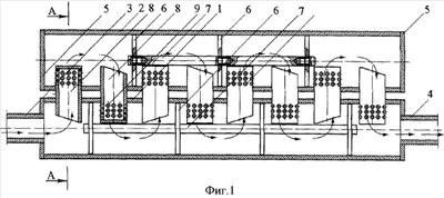 Предлагаемое изобретение состоит из корпуса, изготовленного в виде двух полых цилиндров 1 и 2, с торцов одного из них жестко закреплены входной 3 и выходной патрубки 4, а у другого установлены заглушки 5, при этом внутри каждого цилиндра помещены перегородки 6 в виде пластин размером, равным внутреннему их диаметру, соединенные между собой стержнем 7, причем перегородки в одном цилиндре по отношению к другому размещены в шахматном порядке, а полости в обоих цилиндрах, образованные перегородками 6, соединены между собой переходниками 8, размещенными в отверстиях обоих цилиндров 1 и 2, выполненными в виде стаканов, на боковой поверхности которых у основания перпендикулярно их осям выполнена перфорация 9.